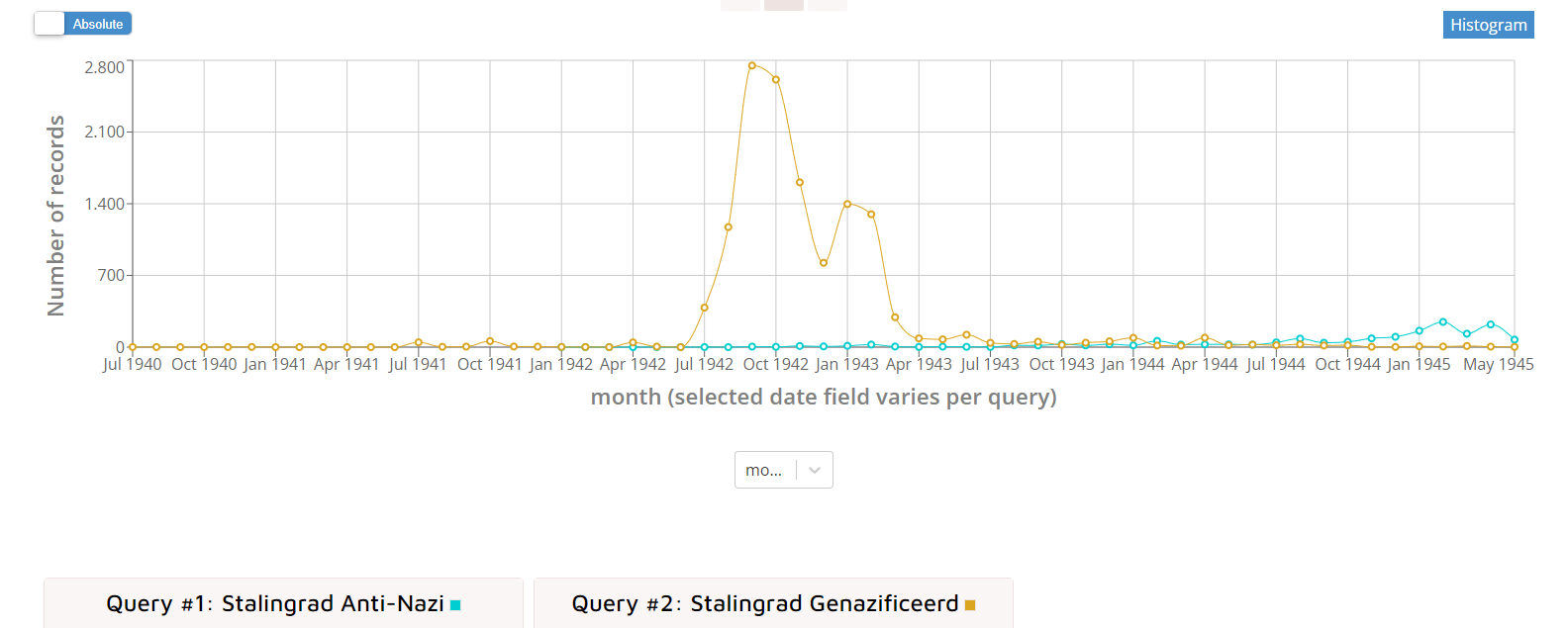 Figure 9: Screenshot of the Media Suite Compare Tool - the absolute numbers of newspaper articles with the term 'Stalingrad' in Nazified and Anti-nazi newspapers.