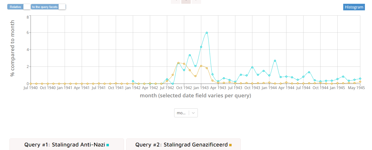 Figure 10: Screenshot of the Media Suite Compare Tool - the percentages of newspaper articles with the term 'Stalingrad' in Nazified and Anti-nazi newspapers.